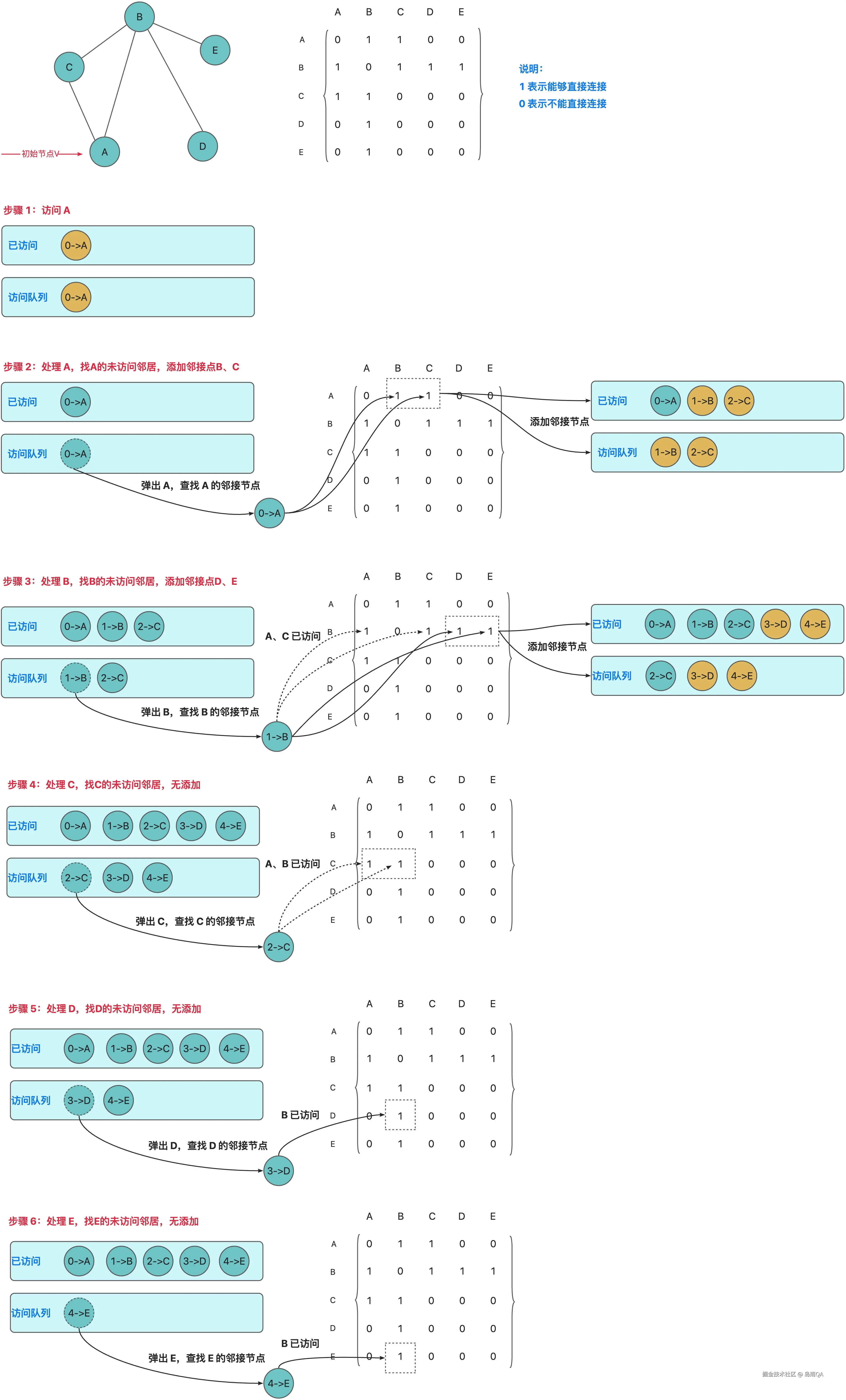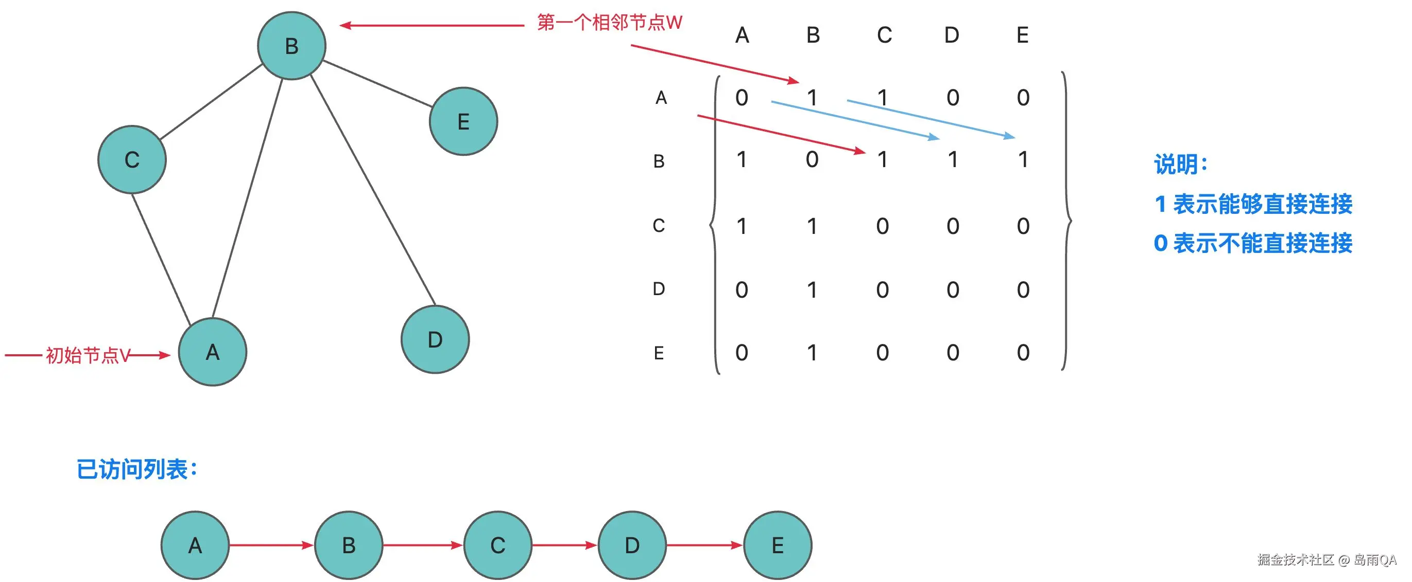 - 若w被访问过,查找结点v的w邻接结点的下一个邻接结点,转到步骤3