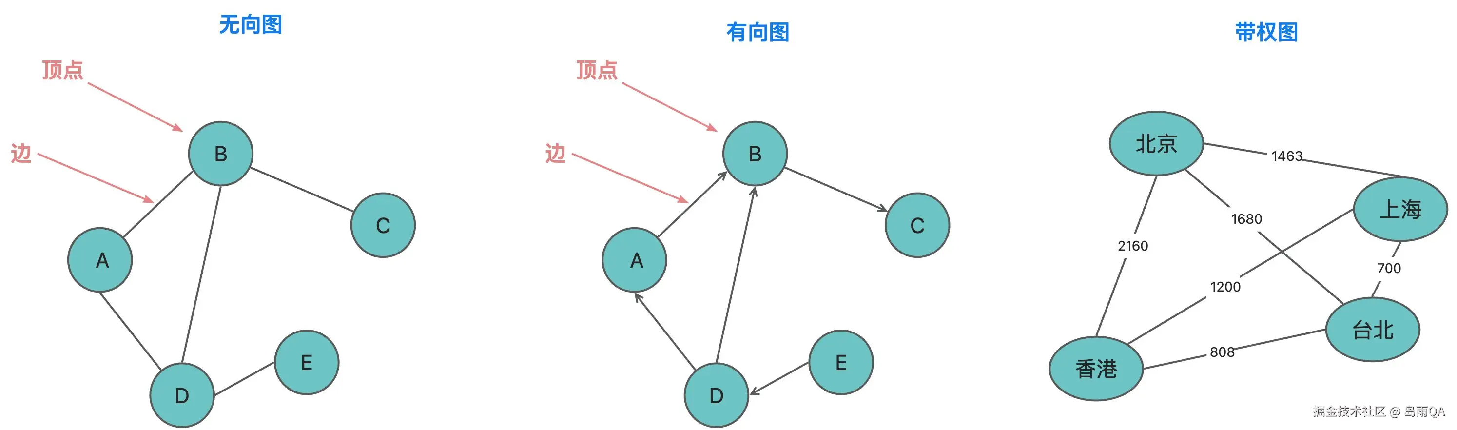 顶点(vertex)边(edge)路径:比如从D->C的路径有:D->B->C、D->A->B->C无向图:顶点之间的连接没有方向。比如A-B,即可以是A->B,也可以是B->A有向图:顶点之间的连接有方向,比如A-B,只能是A->B,不能是B->A带权图:这种边带权值的图也叫网