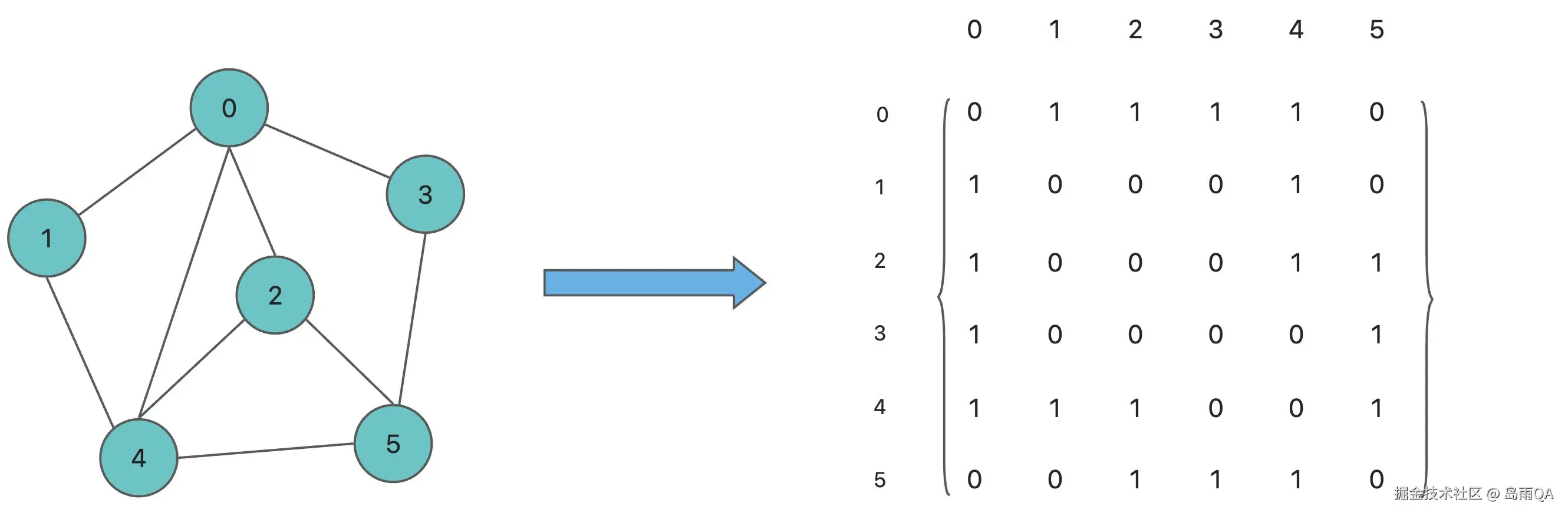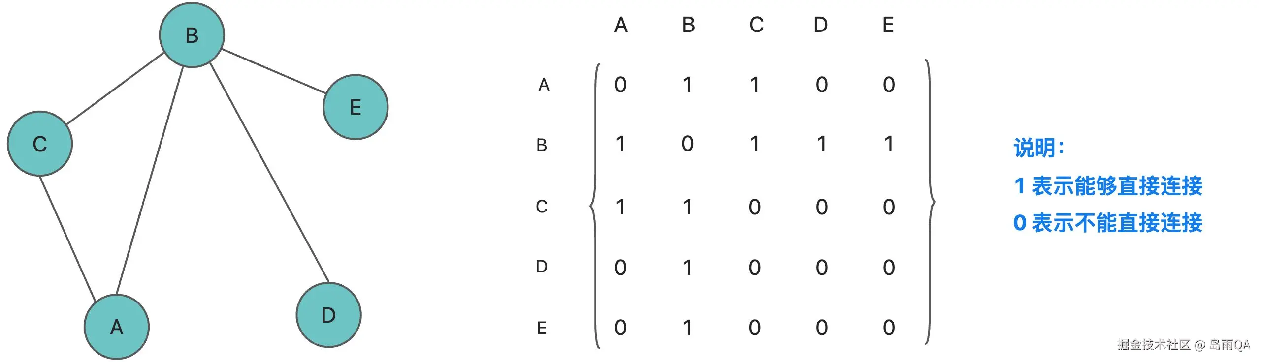 邻接矩阵是表示图形中顶点之间相邻关系的矩阵,对于n个顶点的图而言,矩阵是的row和col表示的是1....n个点。