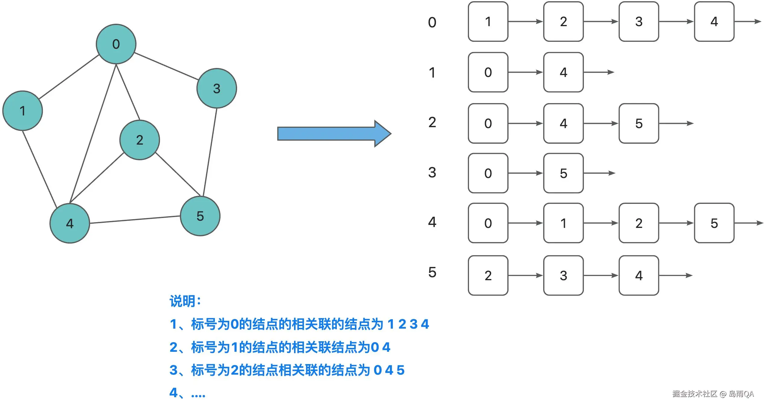 邻接表的实现只关心存在的边,不关心不存在的边。因此没有空间浪费,邻接表由数组+链表组成。