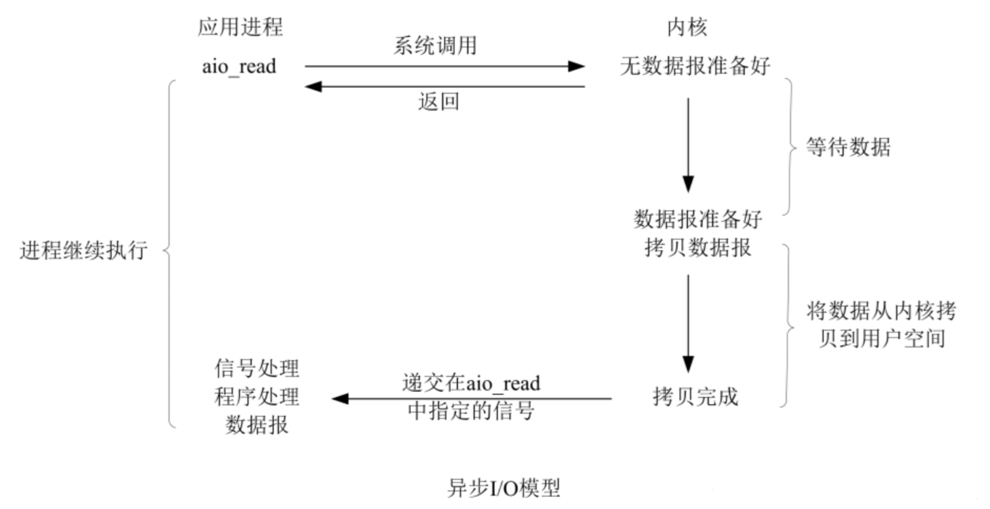 异步IO:由内核在数据拷贝完成时,通知应用程序(而信号驱动是告诉应用程序何时可以开始拷贝数据)。简单来说就是异步IO是事情办完了,然后进行通知;信号驱动IO是通知可以去办事了。