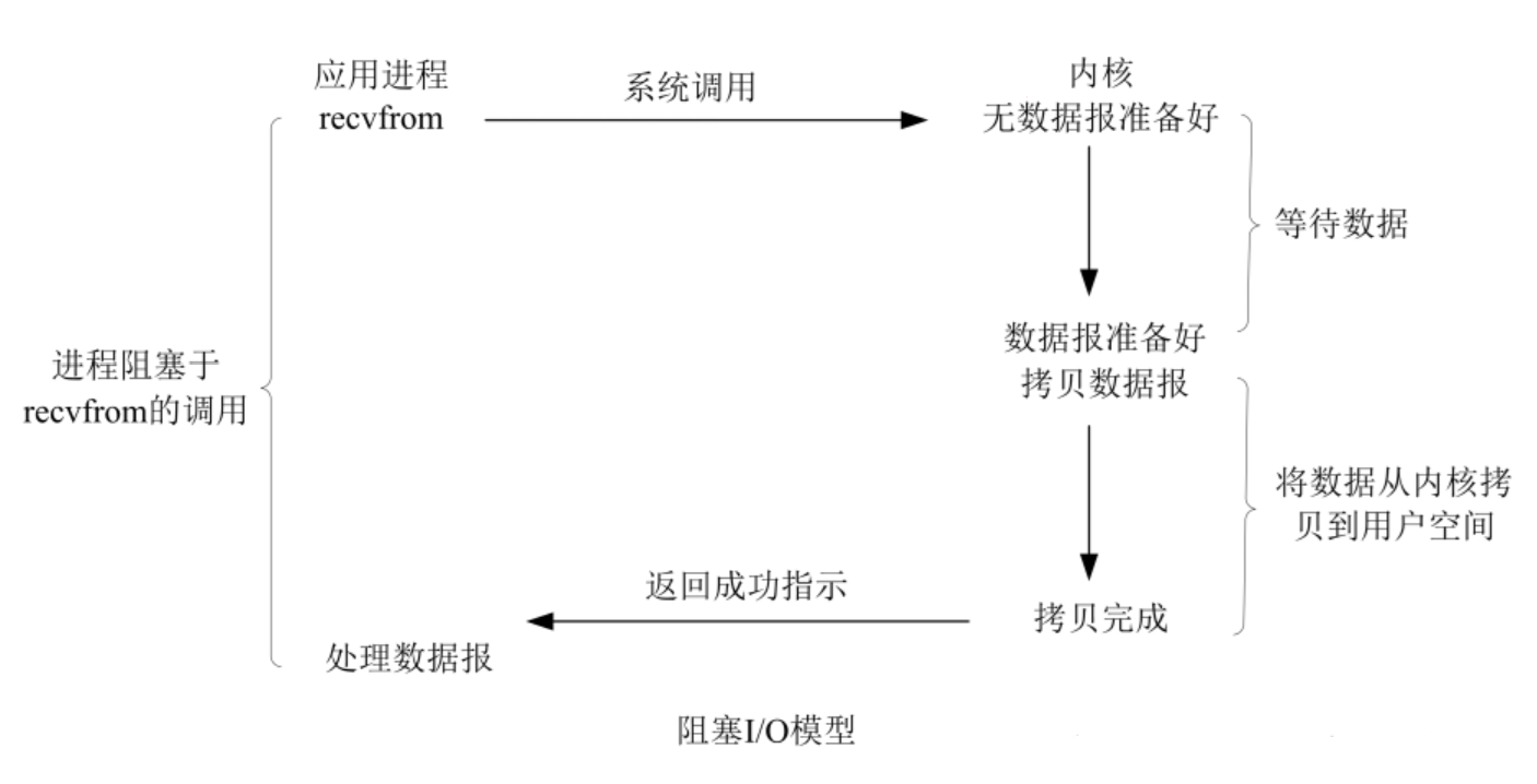 线程调用一个recvfrom,如果资源没有准备好,那么整个线程就会阻塞等待,直到资源就绪才会返回。