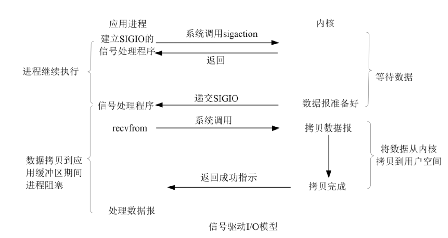 信号驱动IO:内核将数据准备好的时候,使用信号通知应用程序进行IO操作。