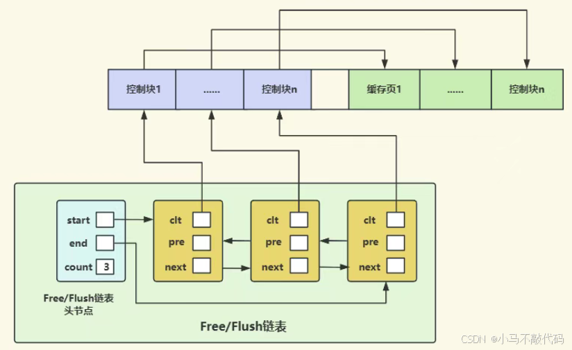 随着MySQL运行,Buffer Pool里的缓存页有空闲的、有正在使用的,还有脏页(修改后未刷盘的)。InnoDB用"链表"高效管理这些页:
