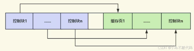控制块本身也占内存,会放在Buffer Pool的最前面,后面紧跟着缓存页。当分配完若干对"控制块+缓存页"后,剩余的内存空间可能不够再放一对,这部分用不上的空间就是"碎片空间"。