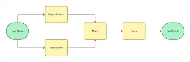 用户查询进来后,关键词搜索和向量搜索并行执行。关键词搜索产出一个词法相关性分数(比如 BM25),向量搜索产出一个语义相似度分数(比如余弦相似度),两路分数再融合成一个统一的排名分数。