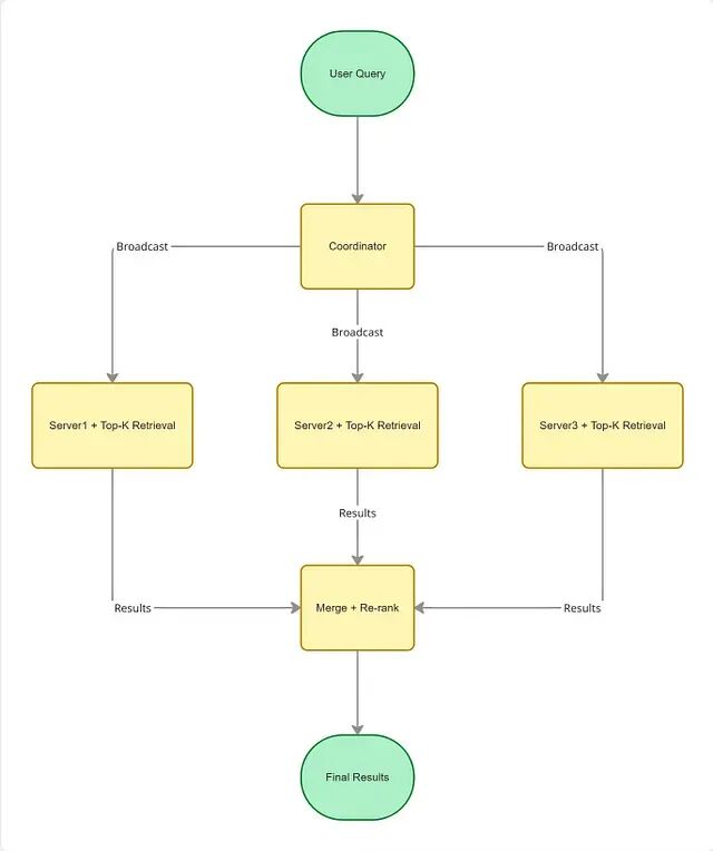 一台服务器扫 1 亿个向量太慢,那就拆成 10 台,每台扫 1000 万,并行跑。工作量分摊了,搜索同步进行,结果最终在协调器节点汇合。这是分布式搜索引擎和现代向量数据库的标准架构。