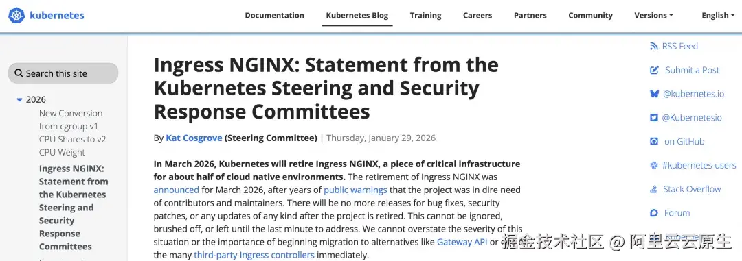 Kubernetes 贡献者社区发布了一篇 blog(Ingress NGINX Retirement: What You Need to Know),Kubernetes SIG Network 和安全响应委员会宣布 Ingress NGINX 退役,公告核心内容包括: