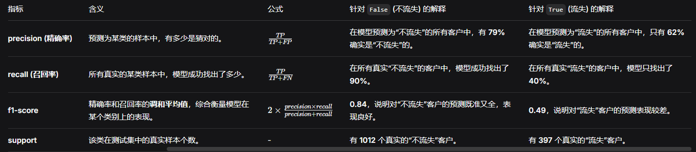 报告展示了两行,对应模型的输出类别。在这个客户流失案例中:
