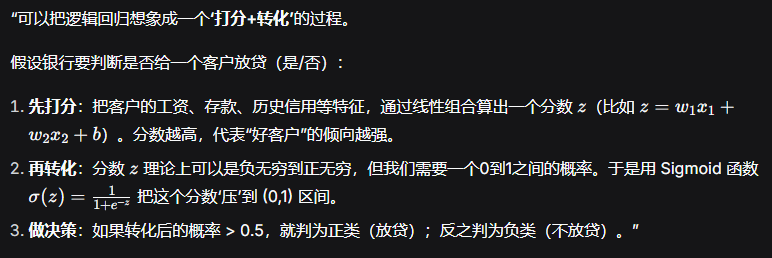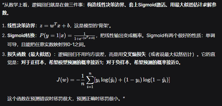 本质理解------是只会调用sklearn.learn.LogisticRegression,还是真正明白它为什么叫"回归"却做分类,它的核心在算什么。"逻辑回归虽然名字里有'回归',但它实际上是一种用于解决二分类问题的线性模型。它的核心思想是:先拟合决策边界(线性回归的活儿),再把线性输出映射到0到1之间的概率(Sigmoid函数的活儿),最后根据概率进行分类。"