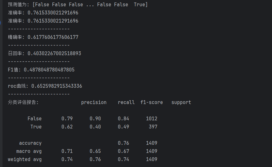 解读 :整体来看,模型在 76% 的情况下能正确判断客户是否流失。但要注意,这个指标在样本不平衡时容易被多数类(不流失)带偏。