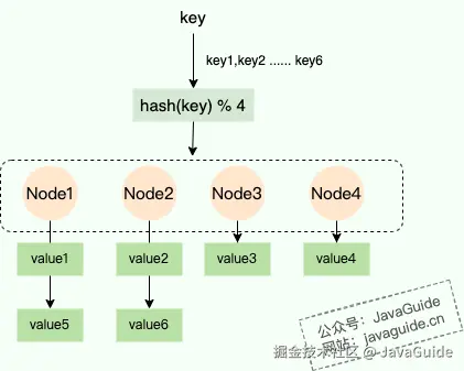 相信大家很快就能想到 "哈希+取模" 这个经典组合。通过哈希函数计算出 key 的哈希值,再对服务器数量取模,从而将 key 映射到固定的服务器上。