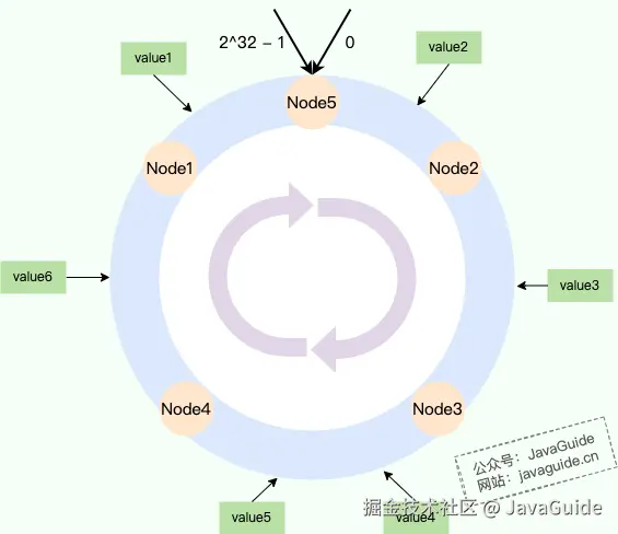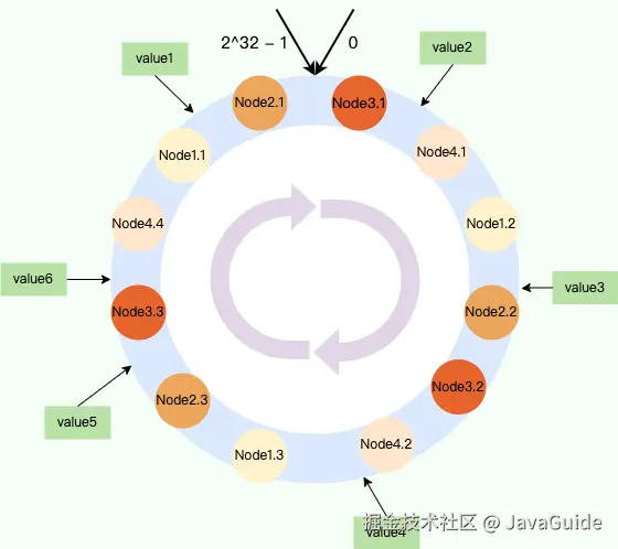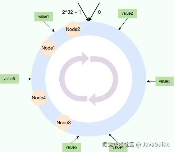 一致性哈希算法将哈希空间组织成一个环形结构,将数据和节点都映射到这个环上,然后根据顺时针的规则确定数据或请求应该分配到哪个节点上。通常情况下,哈希环的起点是 0,终点是 2^32 - 1,并且起点与终点连接,故这个环的整数分布范围是 [0, 2^32-1] 。