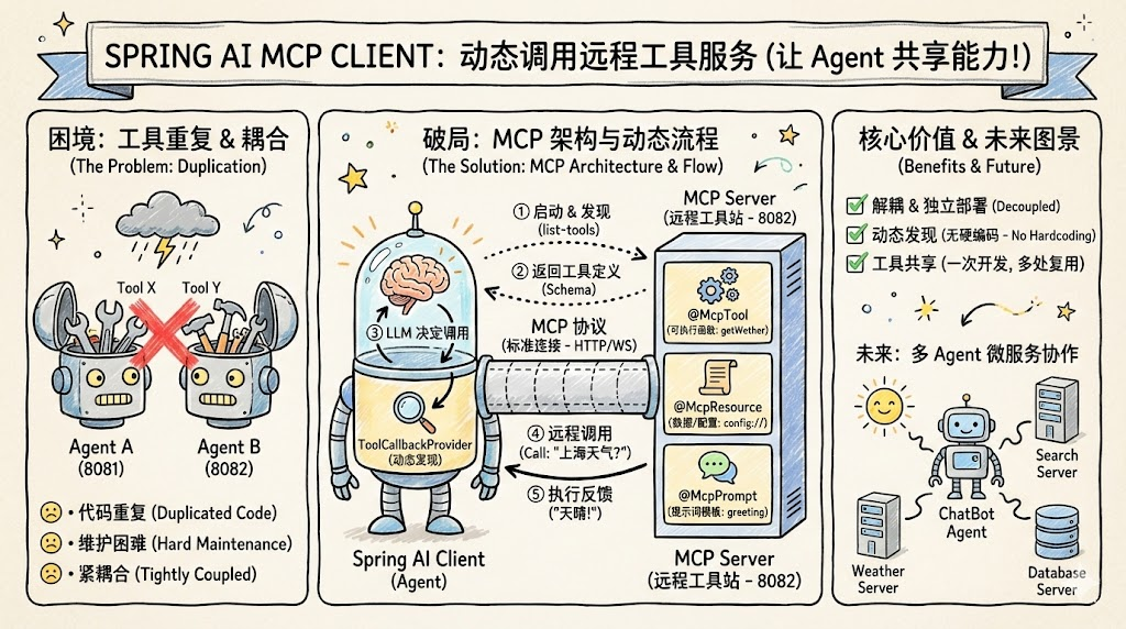 本文将深入讲解MCP协议的设计理念、Spring AI的实现方式,以及如何通过仅仅几行配置,让你的Agent获得访问远程工具服务的能力。