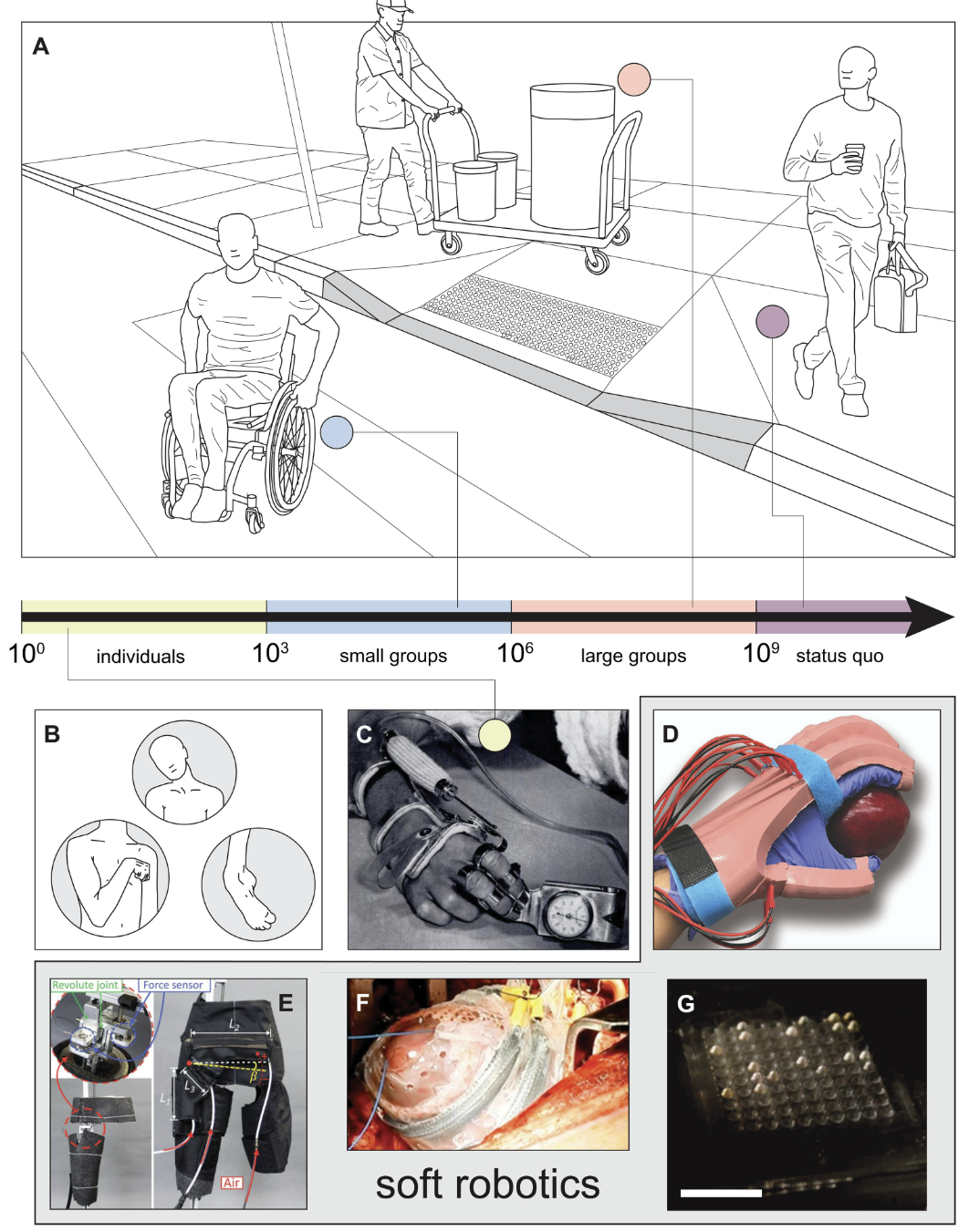 (C)与路缘切割坡道的逻辑相似,麦基本气动执行器的发明,源于满足个体需求:它为其女儿瘫痪的手部恢复了基本活动能力,也为软机器人领域奠定了重要基础。图中一名研究参与者正使用同类麦基本驱动支架测试握力,其中执行器为白色编织圆柱结构。