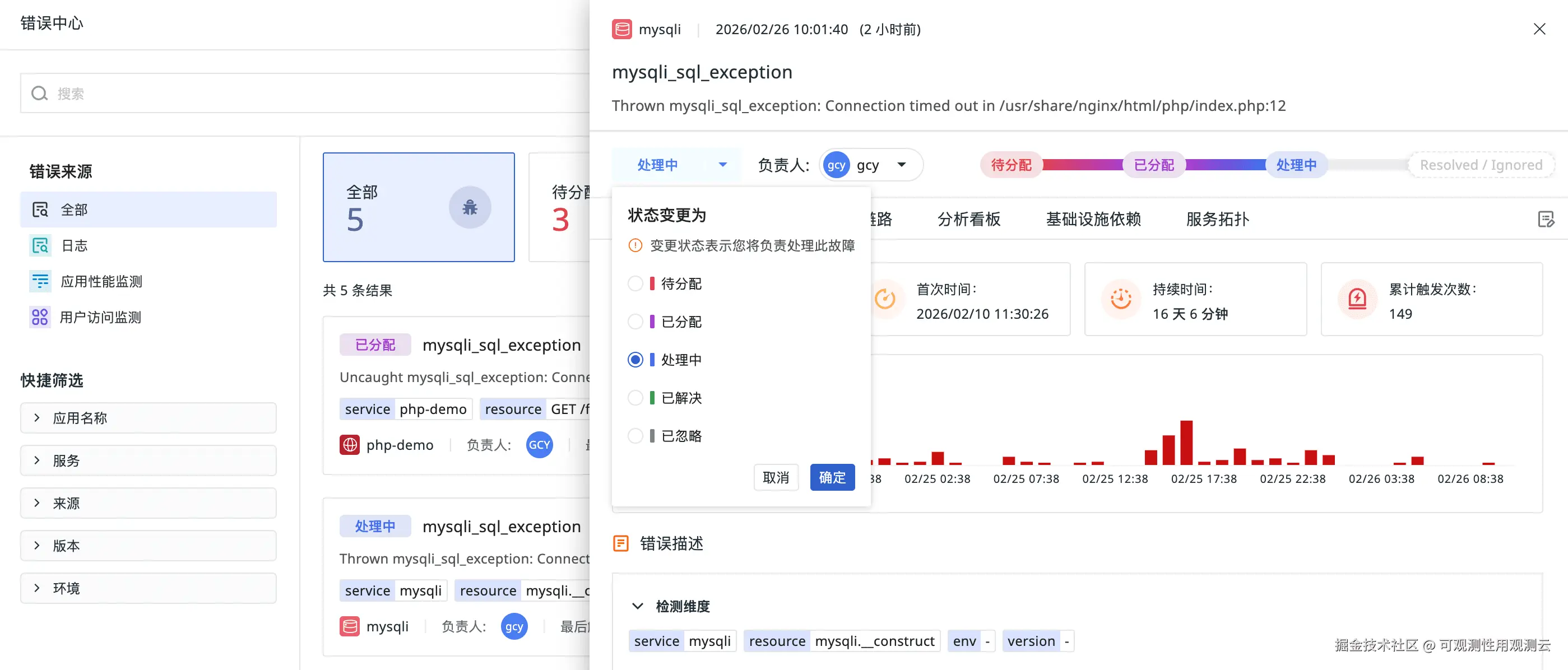 假设监控器检测到"支付服务不可用",同时错误中心显示一个 Issue 显示"数据库连接超时",累计发生 5000 次 Error,状态为待分配(Triage):