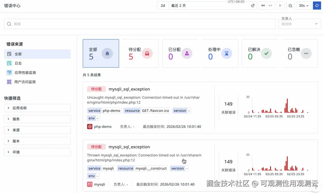 错误中心在你无需配置任何告警的情况下,自动采集全量 Error,并通过指纹(Fingerprint)算法智能聚类为错误根因(Issue):