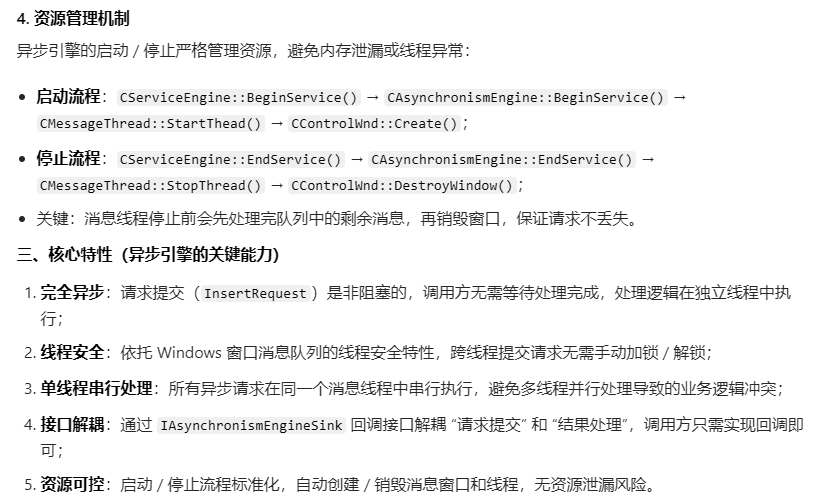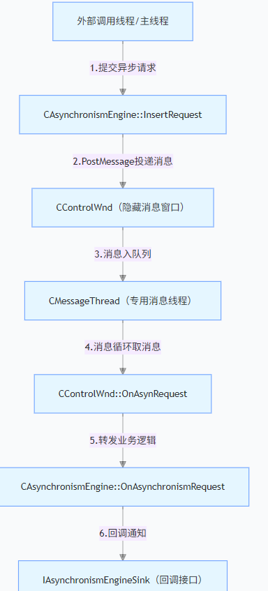 IAsynchronismEngineSink回调接口解耦 "请求提交" 和 "结果处理",符合异步编程的 "通知式" 逻辑; - 回调执行在消息线程中,如需更新 UI,可通过