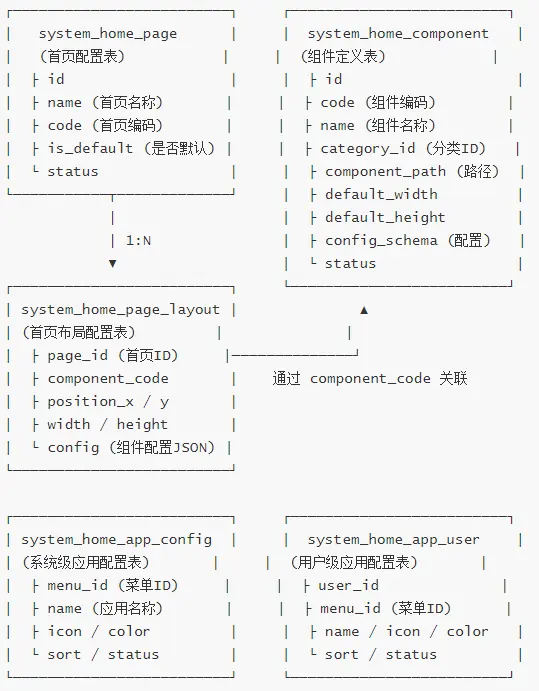 好的数据结构设计是系统成功的基石。RuoYi Office 围绕首页自定义设计了 6 张核心数据表,形成了一个清晰的分层架构。