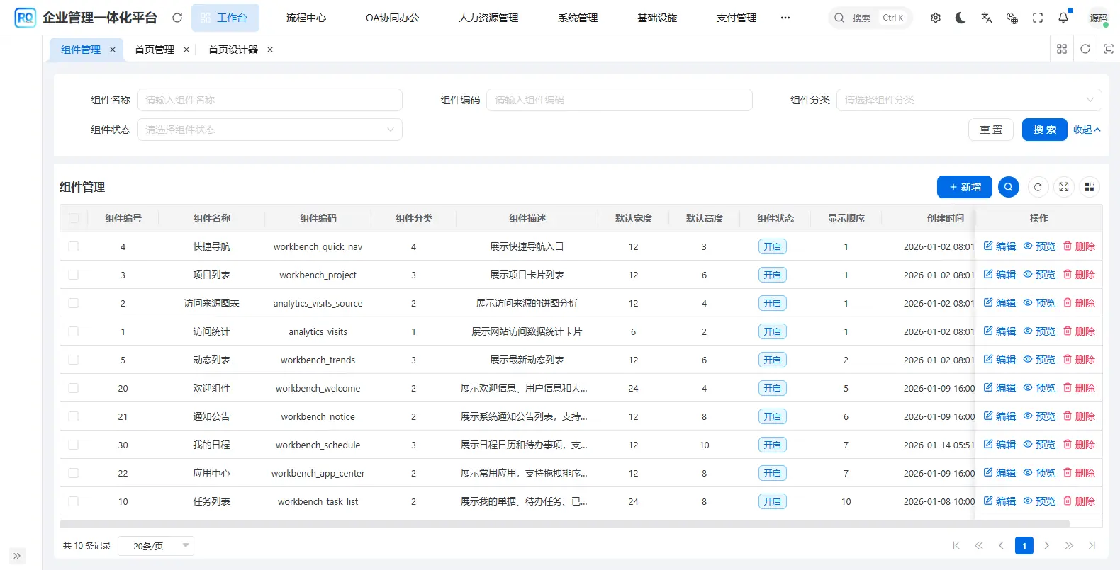 ▲ 组件管理:定义系统中可用的首页组件,支持分类、配置 Schema