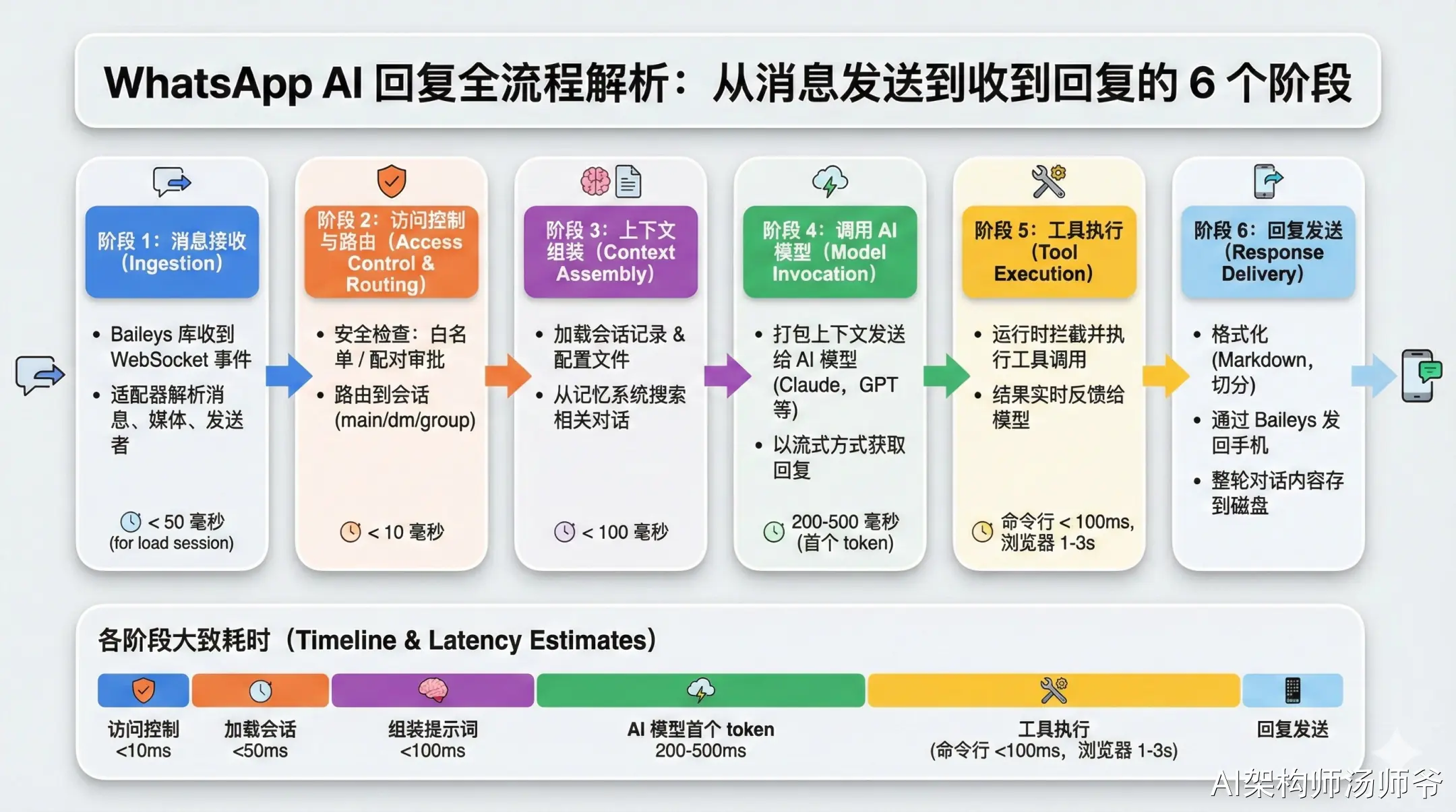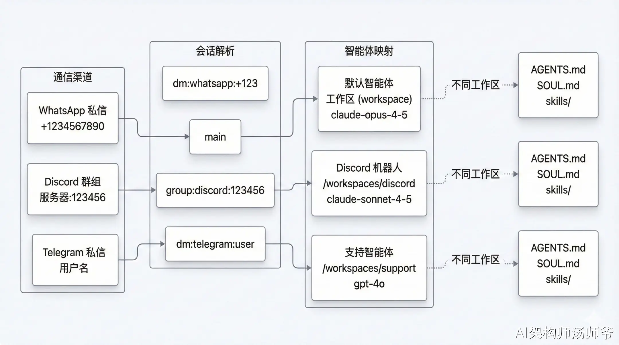 不管你从 WhatsApp、Discord 还是 飞书、钉钉 发消息,体验是一致的。