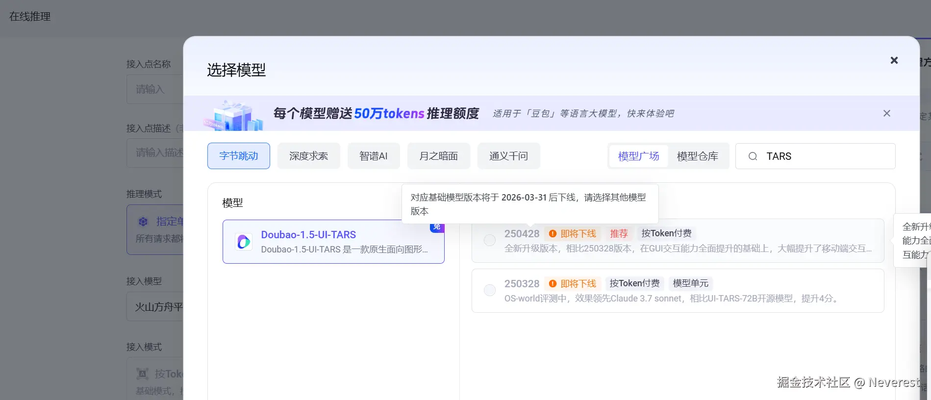 经过多次尝试,Doubao-1.5-UI-TARS模型还是以调用失败告终,最终在自定义推理接入点中发现 Doubao-1.5-UI-TARS模型已经计划日落,无法新增使用(这里要吐槽火山方舟,模型的日落和使用管理比较混乱,在模型广场的主入口没有进行相关提示)