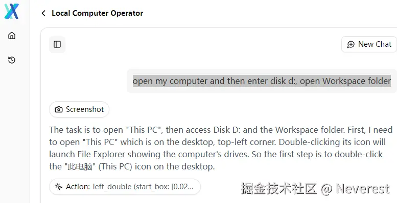prompt:open my computer and then enter disk d:, open Workspace folder 本地调用桌面截图后上传给大模型处理,大模型识根据指令识别到应该调用鼠标点击的位置,直接调用鼠标 Action: left_double