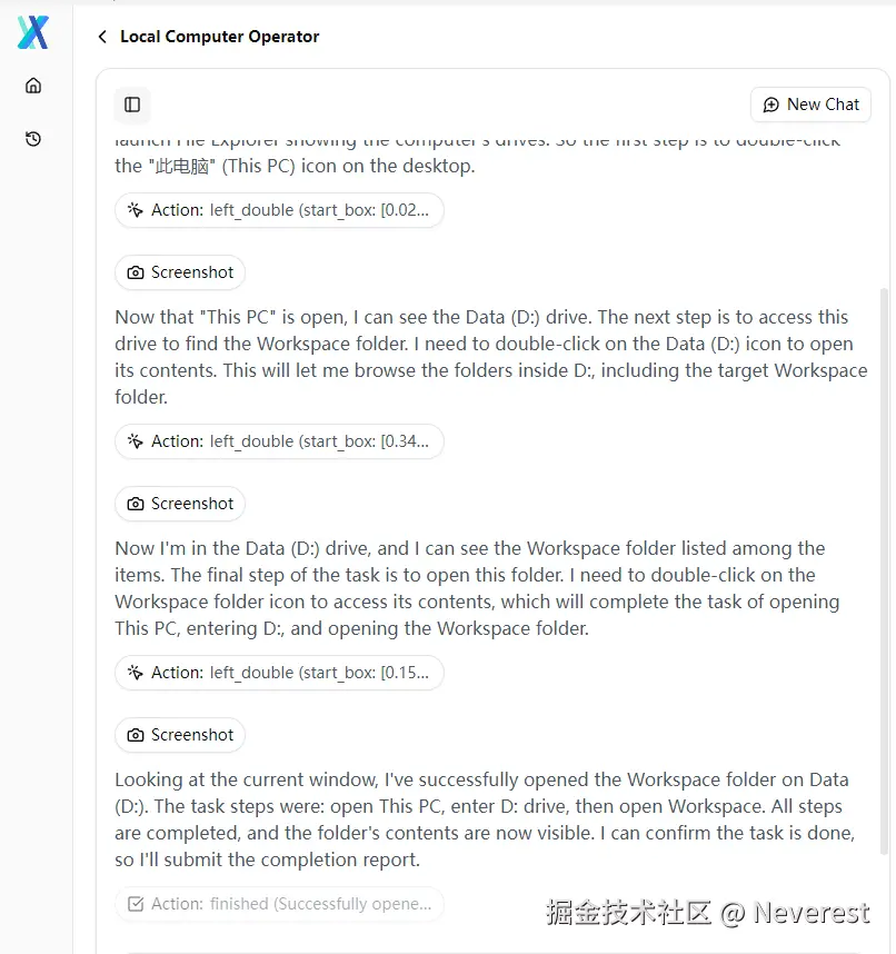 可以看到此处的任务在打开此电脑后,继续执行 截图 -> 上传大模型识别处理 -> Action: left_double打开盘符D -> 截图 -> 上传大模型识别处理 -> Action: left_double打开Workspace文件夹