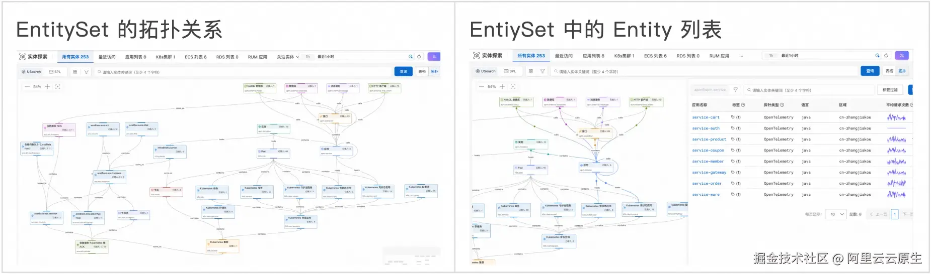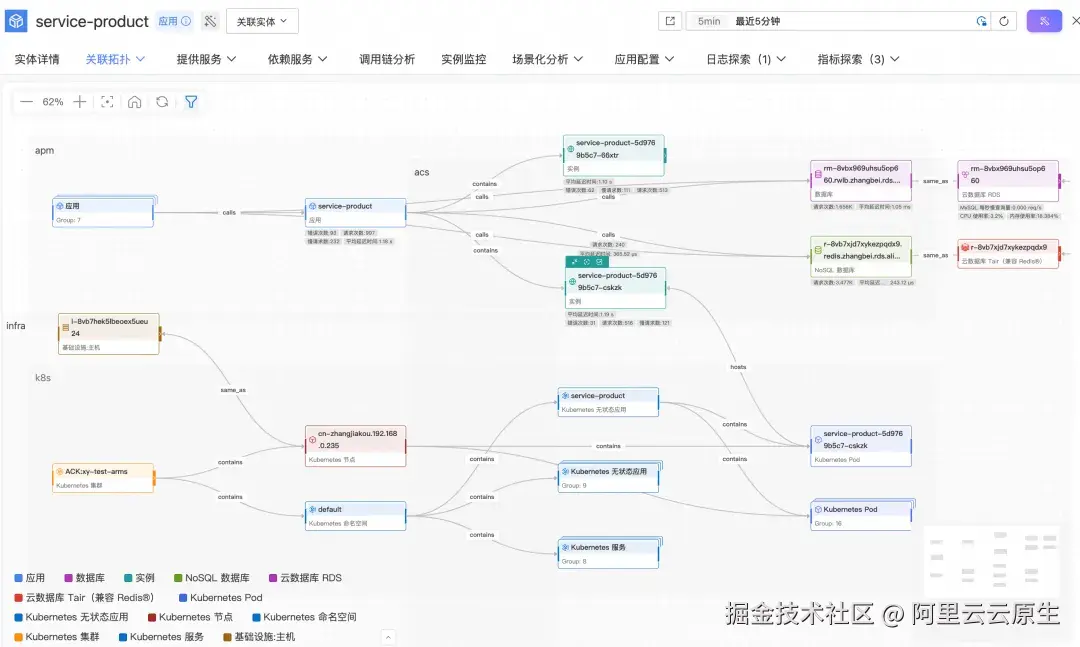 云监控 2.0 基于 Umodel,打造了统一的可观测平台,打通各域之间的数据、构建了各域之间的可观测实体之间的关系,构建了上图所示的实体与关系拓扑。