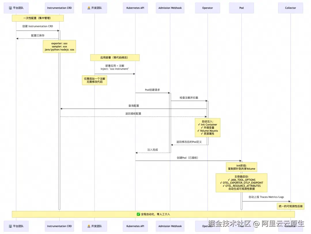 1\] OpenTelemetry-Operator [opentelemetry.io/docs/platfo...](https://link.juejin.cn?target=https%3A%2F%2Fopentelemetry.io%2Fdocs%2Fplatforms%2Fkubernetes%2Foperator%2F "https://opentelemetry.io/docs/platforms/kubernetes/operator/") \[2\] OpenTelemetry 探针自动注入 [opentelemetry.io/docs/platfo...](https://link.juejin.cn?target=https%3A%2F%2Fopentelemetry.io%2Fdocs%2Fplatforms%2Fkubernetes%2Foperator%2Fautomatic%2F "https://opentelemetry.io/docs/platforms/kubernetes/operator/automatic/")