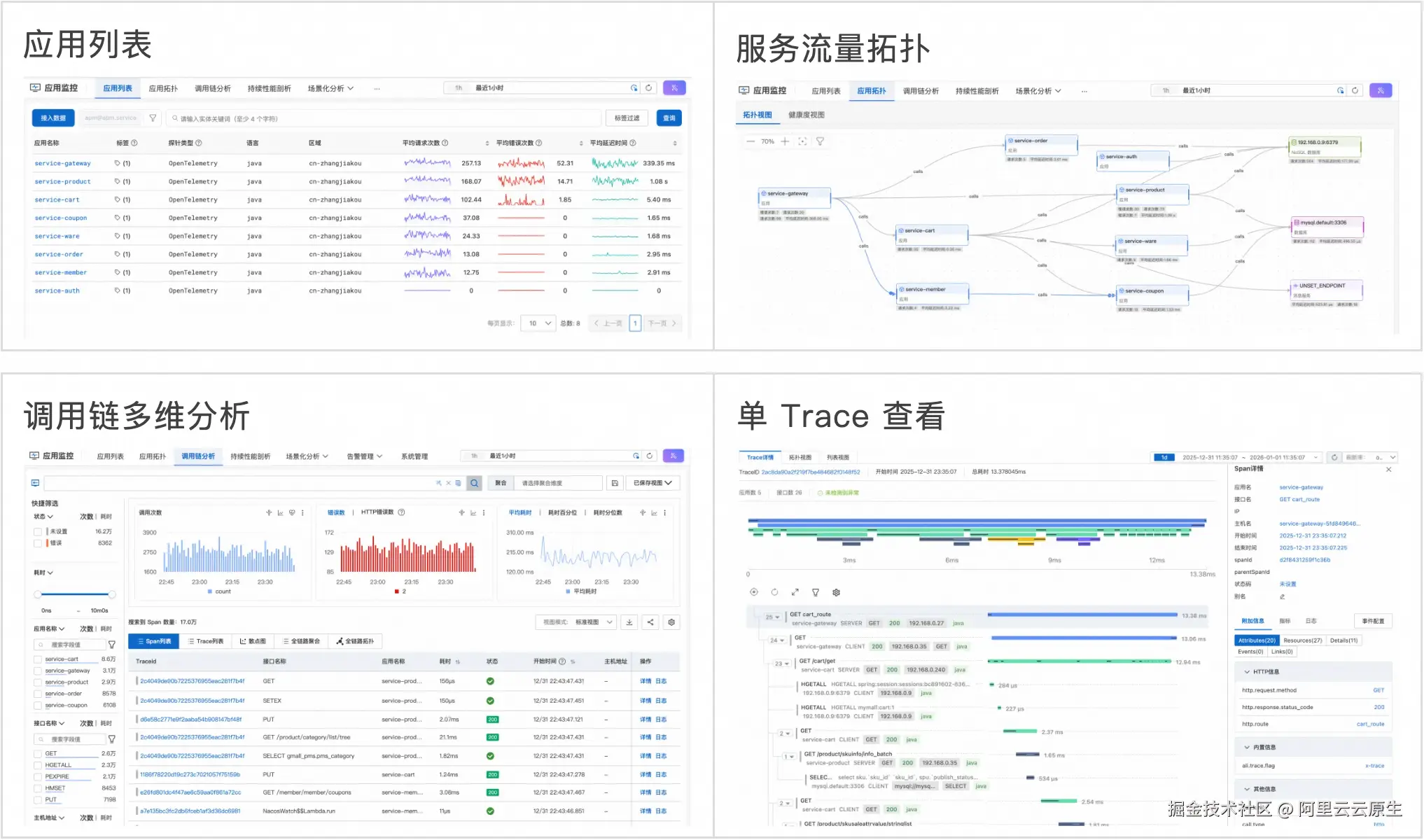 - 应用性能监控:通常包含调用链、服务性能指标、持续剖析等可观测数据,通过开源 OpenTelemetry 或厂商自研的进程级探针采集,构建微服务系统中服务自身的流量指标以及流量调用拓扑。