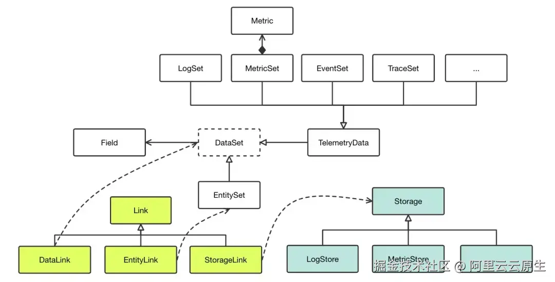 - StorageLink:建模抽象与具体存储之间的关联关系,例如,EntitySet/LogSet/MetricSet/TraceSet/EventSet 都可能关联到一类存储。