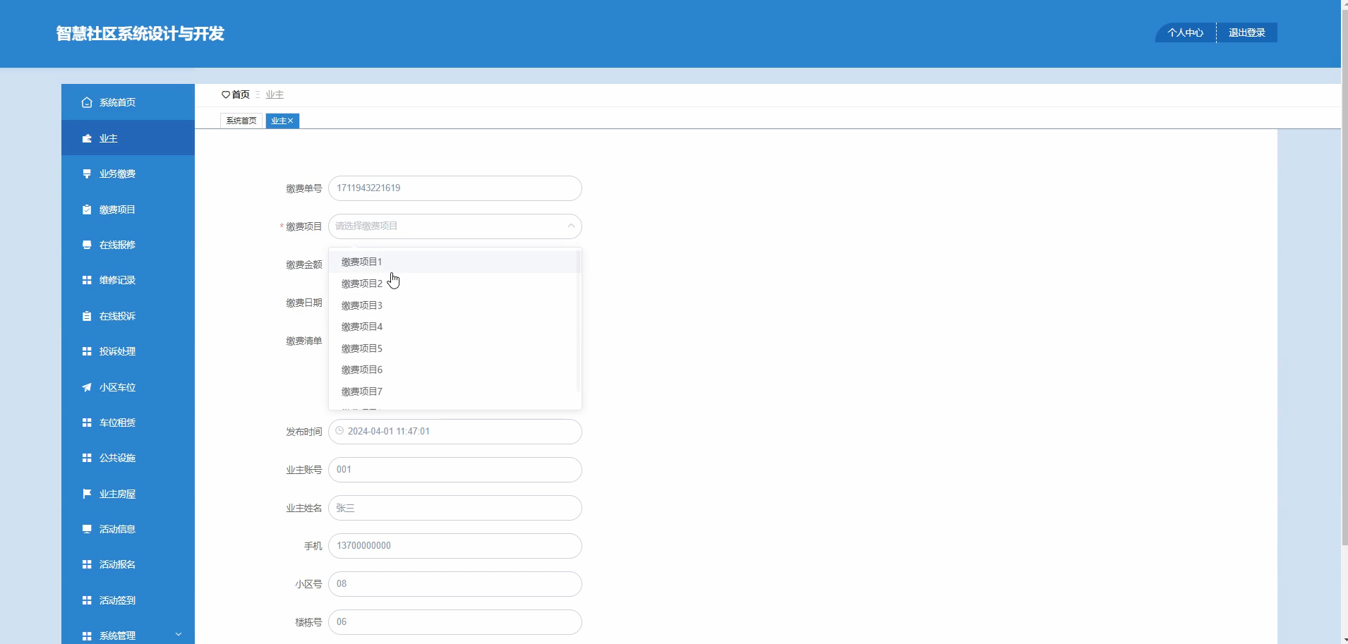 - 物业费用设置与账单生成:物业管理人员可以设置物业费用标准,并生成居民的物业费用账单。