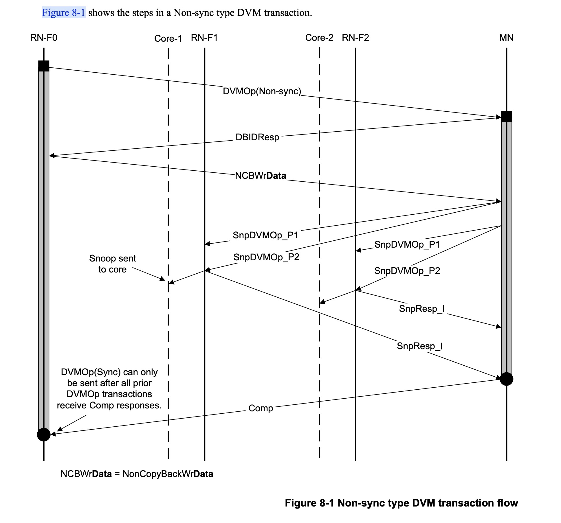 • MN 在向请求者发送针对同步 DVMOp 的 Comp 之前,仍然必须等待接收到该同步 DVMOp 的监听响应。