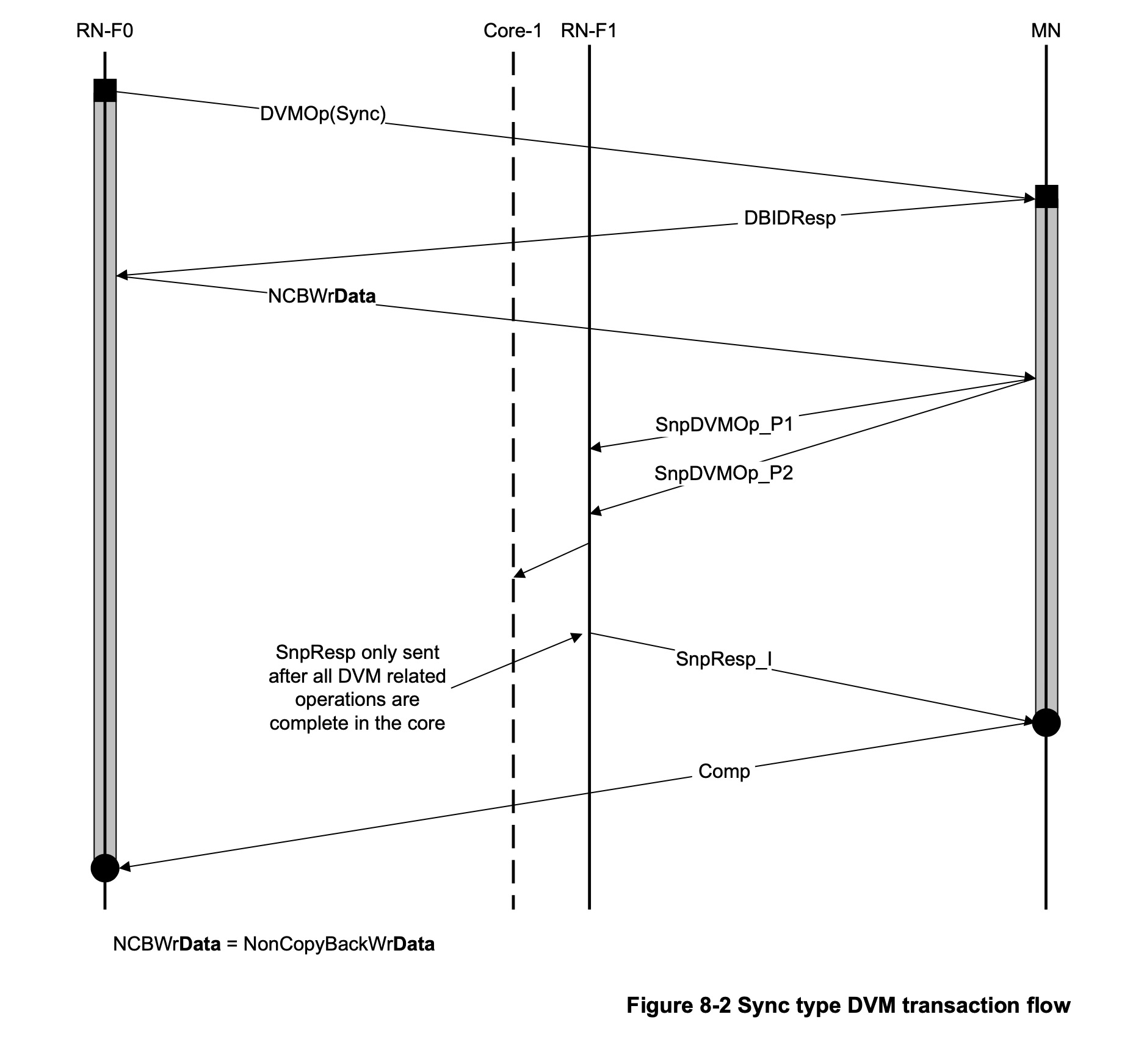 图 8-2 描述: RN-F0, RN-F1 和 MN 之间的交互流程。 1. RN-F0 发送 DVMOp(Sync) 给 MN。 2. MN 回复 DBIDResp。 3. RN-F0 发送 NCBWrData。 4. MN 发送 SnpDVMOp_P1 和 SnpDVMOp_P2 给 RN-F1。 5. RN-F1 完成核内所有 DVM 相关操作后,发送 SnpResp_I 给 MN。 6. MN 发送 Comp 给 RN-F0。 注释: * NCBWrData = NonCopyBackWrData * 只有在核内所有 DVM 相关操作完成后,才发送 SnpResp。