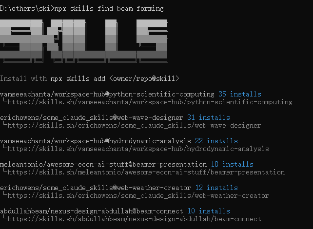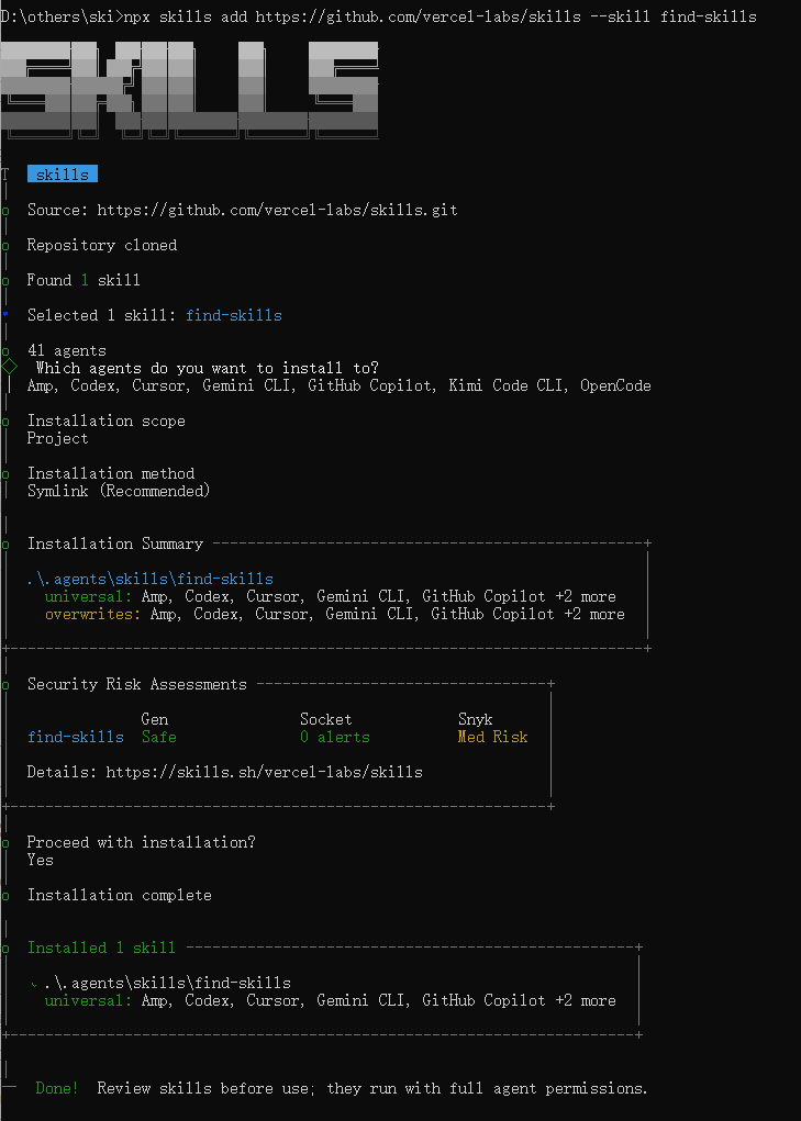 有一个寻找skill的skill,魔幻吧,Find Skills,有个能找到skill的,按照网站的指导安装的简单使用一下:
