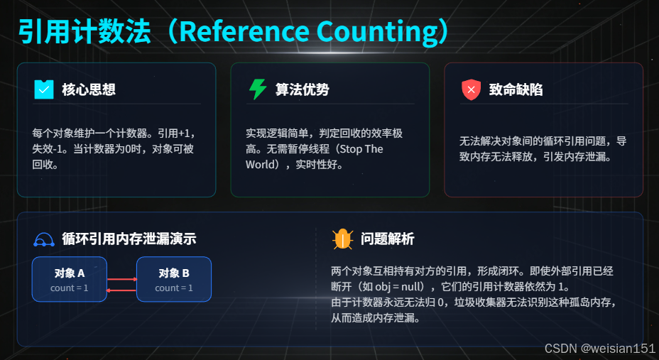 | 缺点 | 无法解决循环引用问题(致命缺陷) |