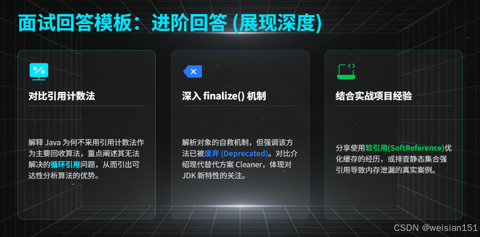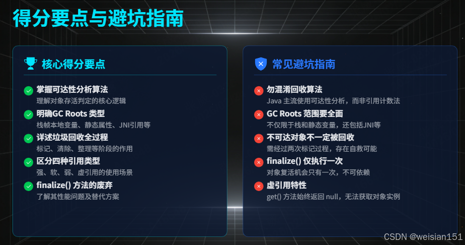 今天,我们将从引用计数法、可达性分析、GC Roots 范围、对象回收过程、四种引用类型 五个维度,层层递进地拆解这道面试必考题,并附上创作思路、得分要点、避坑指南,助你面试中脱颖而出。