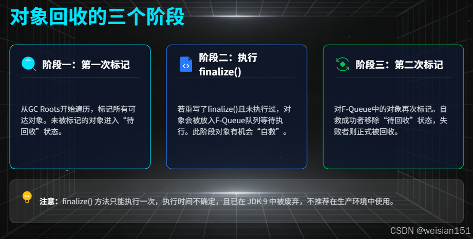 对象回收过程:第一次标记 → 执行 finalize() → 第二次标记 → 回收。