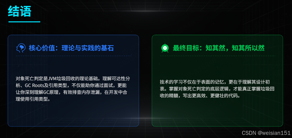 对象死亡判定是 JVM 垃圾回收的理论基础。理解可达性分析、GC Roots、引用类型,不仅能帮你顺利通过面试,更能让你: