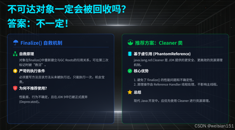 "不可达对象不一定会被回收,可能通过 finalize() 自救。但 finalize() 已废弃,推荐使用 Cleaner 作为替代方案。"