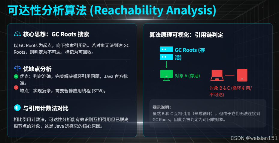| 优点 | 解决循环引用问题、判定准确、Java 官方采用 |