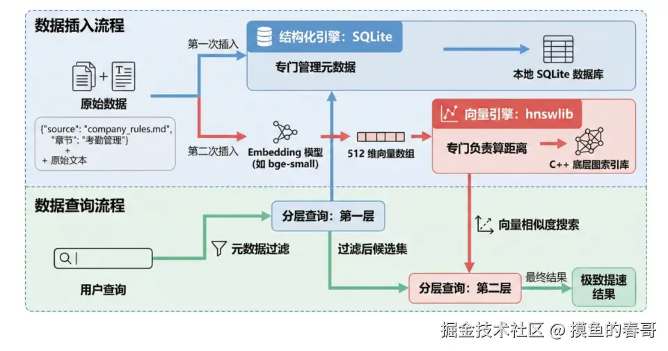 第一次:存入一段带有 Metadata 的数据(比如 {"source": "company_rules.md", "章节": "考勤管理"})以及它的原始文本时,这部分数据是被存放在本地的 SQLite 关系型数据库里的。
