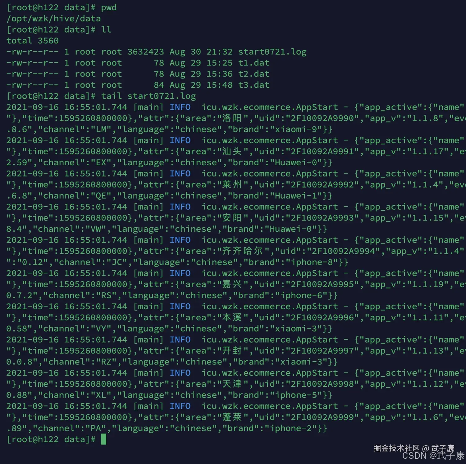 2021-09-16 16:55:01.744 [main] INFO icu.wzk.ecommerce.AppStart - {"app_active":{"name":"app_active","json":{"entry":"2","action":"0","error_code":"0"},"time":1595260800000},"attr":{"area":"洛阳","uid":"2F1009