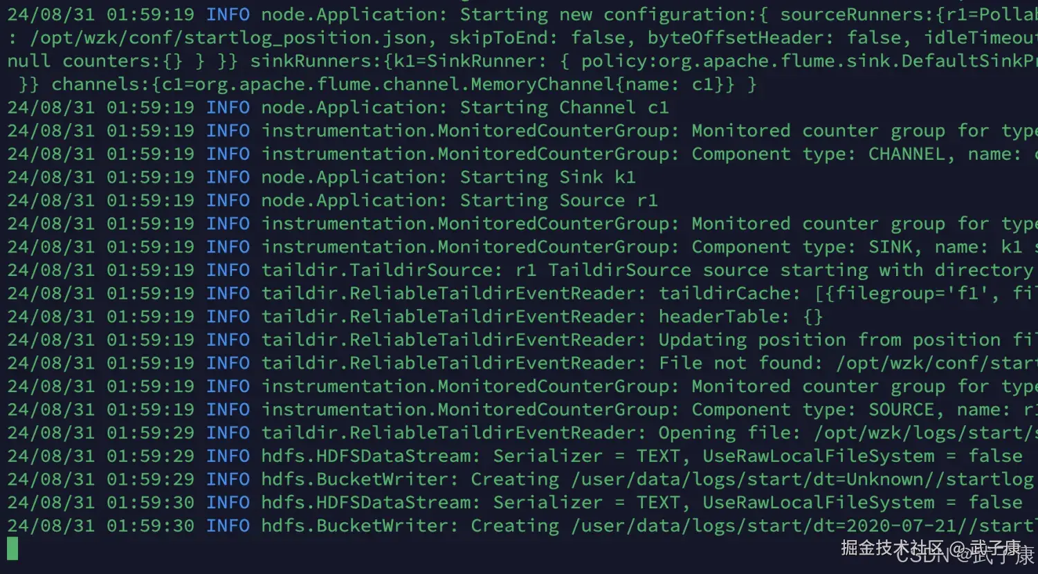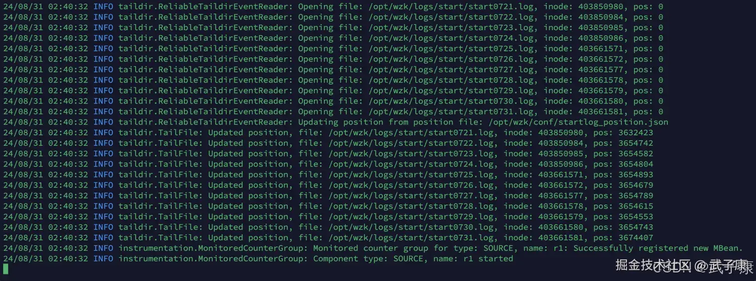 24/08/31 01:59:19 INFO taildir.ReliableTaildirEventReader: Updating position from position file: /opt/wzk/conf...