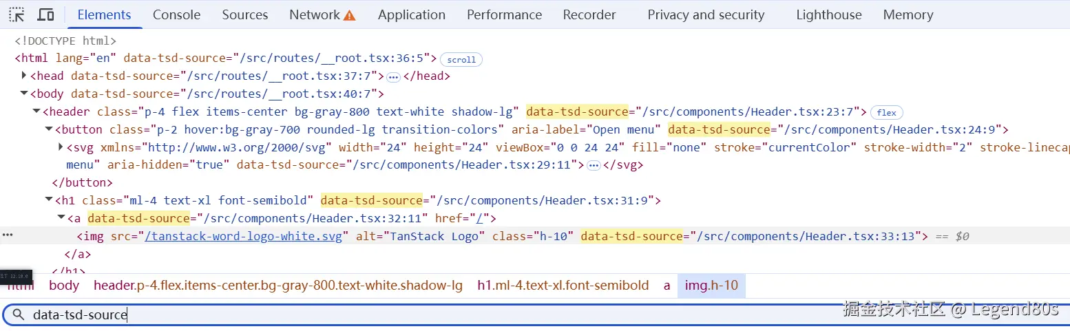 首先 data-tsd-source 是 Tanstack Start 的特色,通过 @tanstack/devtools-vite injectSource 控制引入: