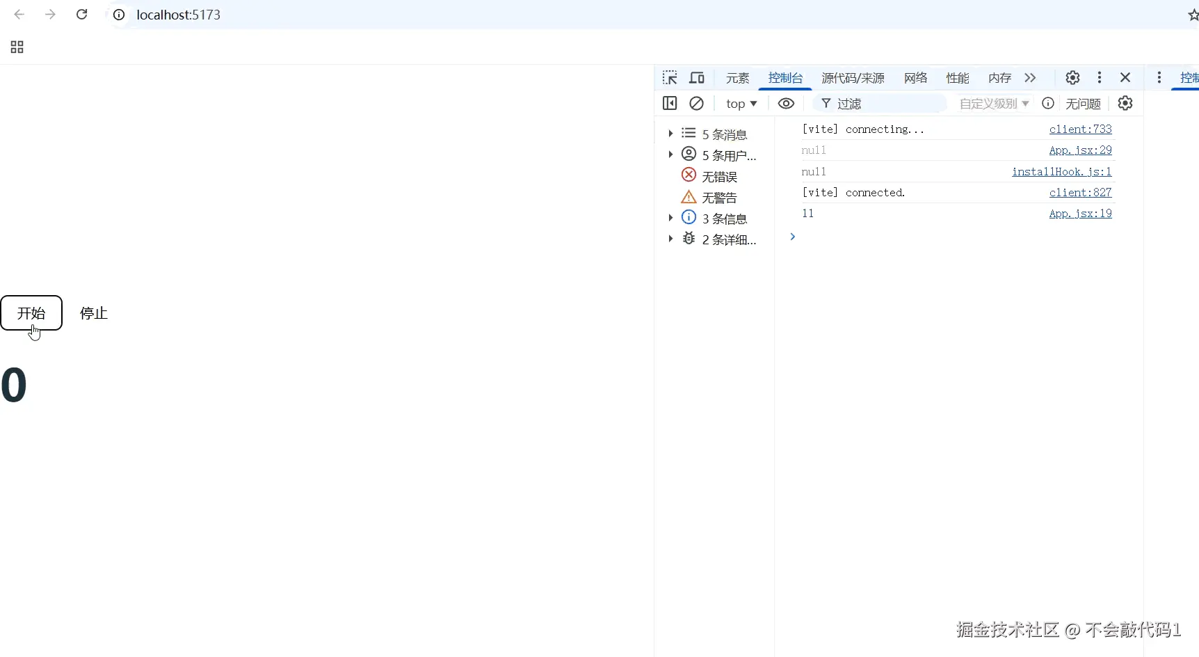很多初学者会尝试用普通变量来保存定时器 ID,但这样在组件重新渲染时变量会被重置,导致无法清除定时器。下面我们通过一个例子来感受这个问题的严重性。