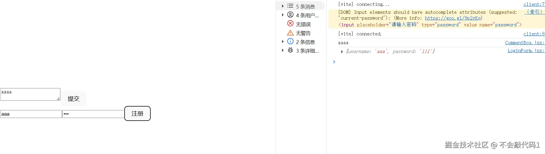 <input>是非受控组件 :它没有设置value属性,用户输入直接反映在输入框内,我们通过ref在提交时读取它的值。 - 点击提交按钮,控制台会输出两个输入框的当前值。