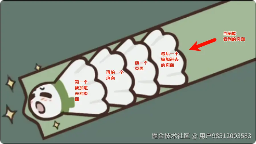 - 栈顶的内容(羽毛球桶最上面的羽毛球)就是当前可以看到的页面(下面的被遮住了肯定看不到)