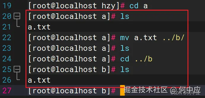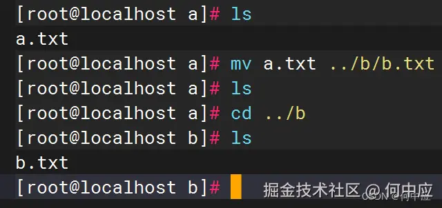 cp 源文件/文件夹 目标路径:拷贝文件或文件夹(如将a文件夹内的a.txt文件拷贝到b文件夹中);